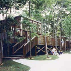 "ふらのアイスミルク工房"は農畜産業と観光のまち富良野市の南東部の丘"はるにれフーズパーク"に位置しています。 近年の過剰牛乳対策の一環として設置されたふらの市の農産公社(チーズ工房)が運営する新たな施設で、地元産の牛乳と野菜を原料にしてつくられた手づzくりの゛ふらのアイスミルク″の生産と直販及び製造工程の見学を行う小さな施設です。92年のチーズ工房の新設以来、このエリアを訪れる観光客は年々増大し95年度には13万人を突破し、ふらのの観光拠点となりつつあります。この拠点の新たな魅力づくりと゛はるにれフーズパーク″散策のネットワークづくりとして本計画は位置づけられています。敷地はチーズ工房の東側約30mのなだらかな勾配をもつ、白樺、ナラ、イタヤカエデの多い雑木林の中に設定されています。この工房は、富良野市南東部の丘に位置し地元産の牛乳と野菜を原料に手作りの”ふらのアイスミルク”の生産、直販と見学を行う小さな施設です。計画は、富良野の風景の中に静かに佇み、訪れた人々が木漏れ日の中で北海道の自然を味わう姿をイメージして進められており、森の樹木を極力残しています。ポイントとしては、北海道産の木材と木製の硝子カーテンウォールにより構成され、店舗内に自然を取り込み、建物を森の中にとけ込ませています。 |